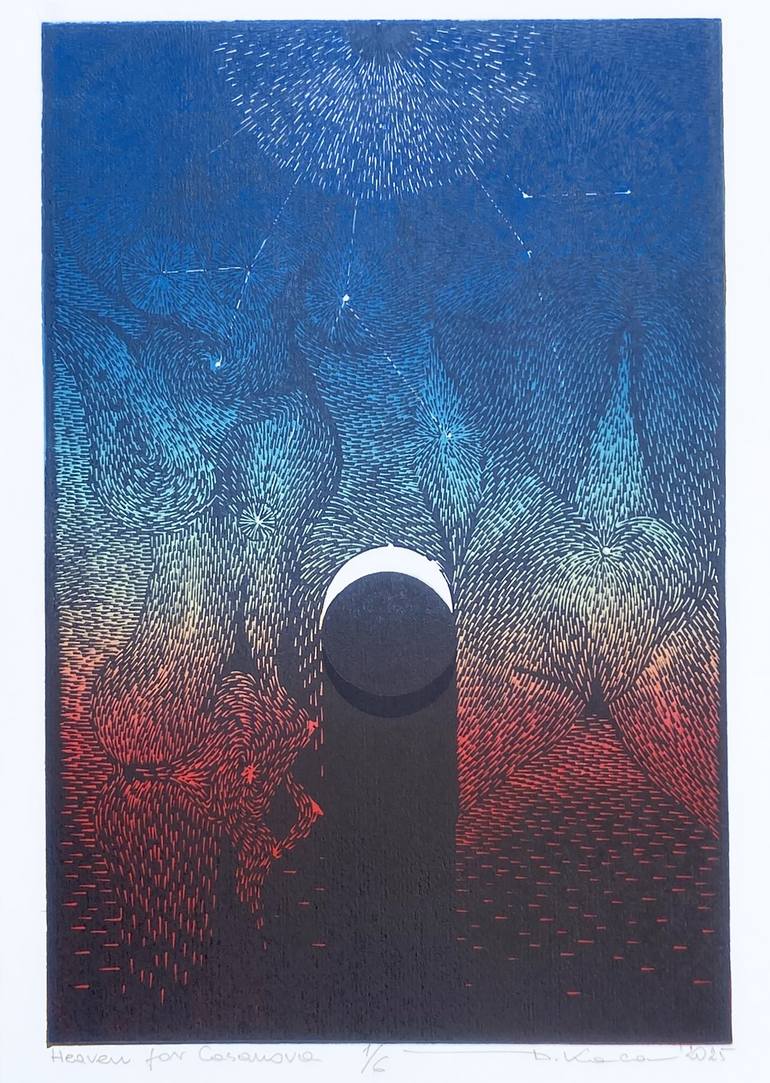 This graphic image is inspired by the rich biography of Giacomo Casanova. His adventurous lifestyle and numerous love affairs. The black and white version of this graphic is shown as part of the international project "Giacomo Casanova". Linocut is printed in small edition 6 copies on Magnani paper...