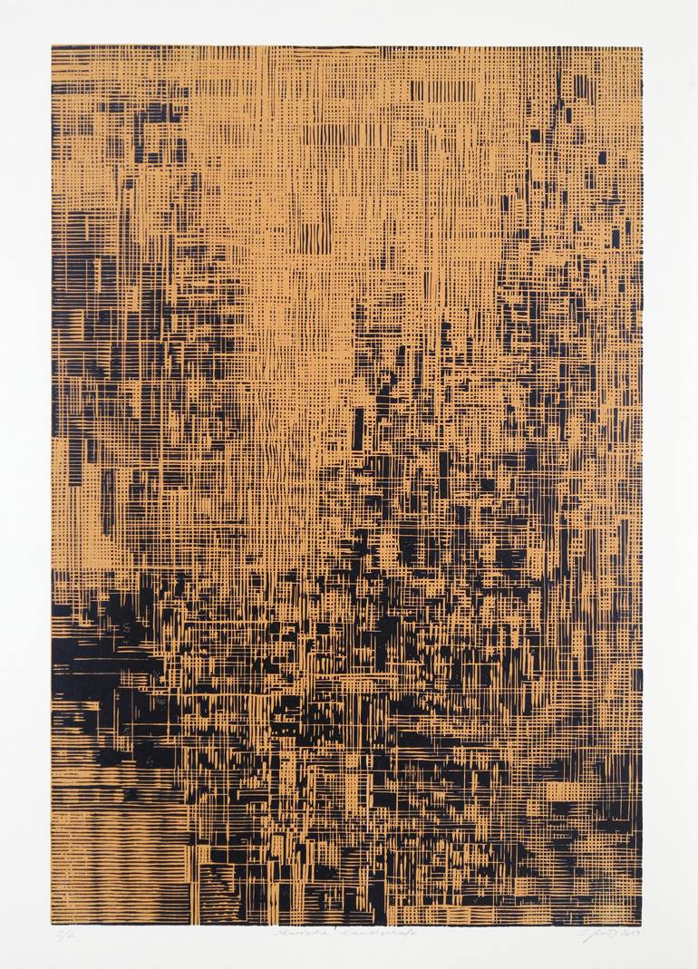 Stefan Osnowski is a German visual artist who employs one of the oldest reproduction techniques to create an intricate, digitally-inspired, ultra-modern aesthetic. He exclusively uses the centuries-old process of woodblock printing. Osnowski explores digital codes, transforming them into analog representations to depict phenomena such as time, movement, and space within a two-dimensional image frame. This transformation involves converting the image into an abstract binary barcode—1s and 0s—carved into a wooden panel and printed by hand using palm-sized glass lenses. The process of selecting a theme or medium is as integral to the concept as the physical contact and craftsmanship involved. In 2024, Osnowski was awarded third place in the international Luxembourg Art Prize. He lives and works in Lisbon. „My work explores the tension between structure and unpredictability, transforming familiar motifs into shifting frameworks of time and space. By weaving geometric harmony with chaotic disruptions, I blur the boundaries between rationality and emotion. The result is a visual language that oscillates between control and spontaneity, figuration and abstraction—inviting the viewer to navigate a dynamic, ever-changing landscape.“