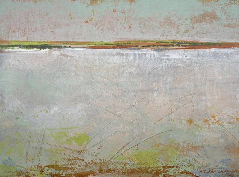 "Ivory Shore" blends muted hues and soft textures, evoking the tranquil meeting of earth and sky. Pastel blues and pinks merge with deep greens and browns, while pale gray brushwork adds movement and depth. This serene composition fosters peace and grounded energy. • Archival giclée print on stretc...
