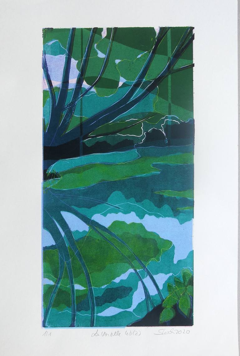 50 cm x 25 cm on 60 cm x 40 cm Pper (170 g). I walked last year along a small river (La Voiselle) near Bourges in middle France where I have my summerstudio and discovered watermirroring as a new theme for my paintings and woodcuts. This woodcut has 6 colours, each color is one seperately cutted woo...
