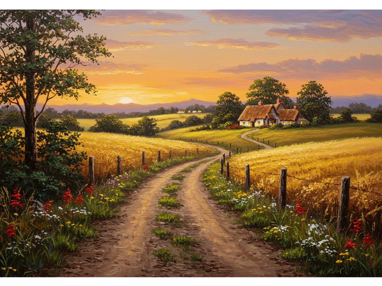 Rustic Farm Road at Sunset" – A Journey Through Warm Nostalgia Concept & Inspiration This artwork captures the timeless charm of the countryside, where a winding dirt path leads toward a cozy, distant cottage bathed in the golden hues of sunset. Inspired by the romantic landscapes of the Hudson...