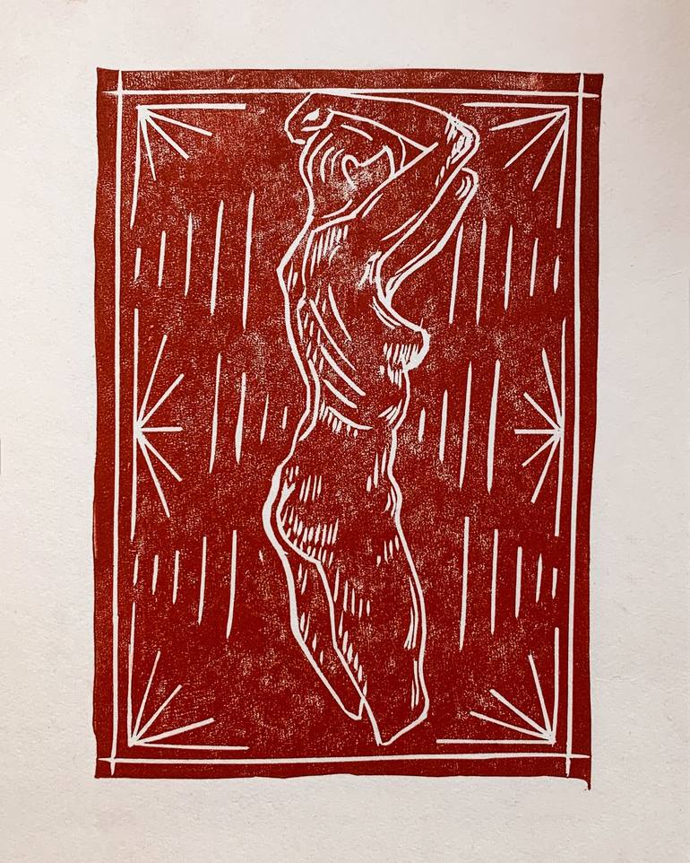 A striking linocut print captures the essence of femininity through bold simplicity. The woman’s body, carved with deliberate, flowing lines, emerges in a deep, passionate red, symbolizing strength, sensuality, and vitality. The contrast between the rich red ink and the crisp, negative space creates...