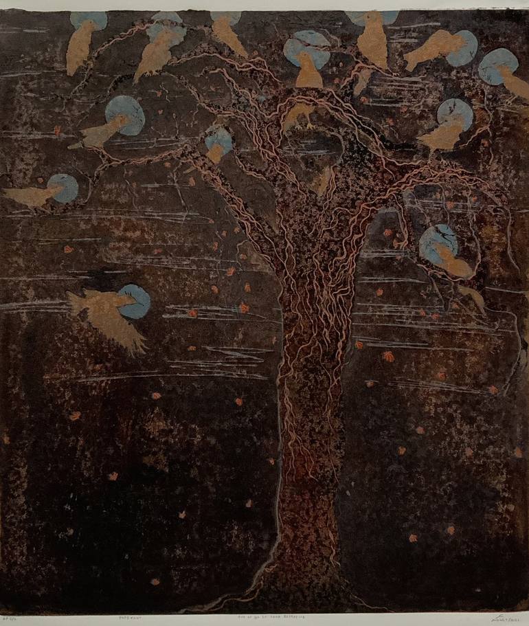 Having witnessed an incident where a crow was preaching to its cronies, inspired this work. After several minutes, a scuffle broke out amongst the crows, making one wonder what the uproar was all about. It is also reminiscent of the last supper. This is an original hand-pulled Forexcut print, not a...