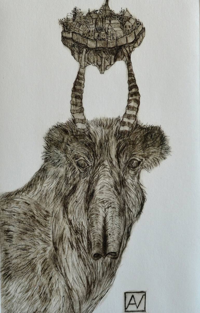 I created this etching inspired by a picture of Mont Saint-Michel and the story about the people that remained trapped on the island when the tide came in. I imagined this island like an intimate fantasy of a place so beautiful where the sea decides whether you can accede or not. This place miraculo...