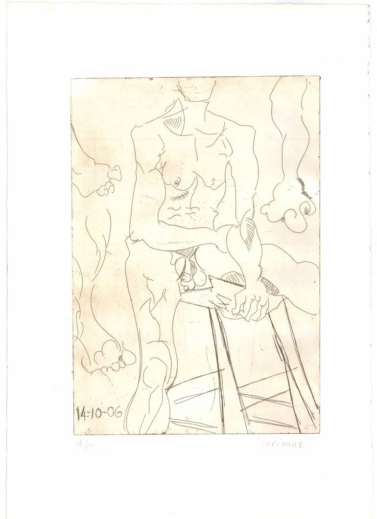 "Seated male nude with body parts " is an etching using the traditional method of hard wax ground. An etching needle is used to draw into the plate. I think this is a most exciting way to draw as each mark feels so final. A good quality piece depends on pressure applied by etching needle, d...