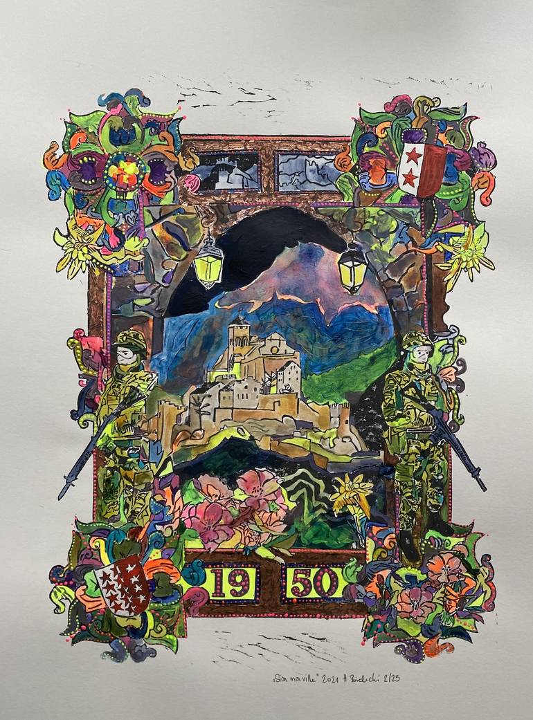 This piece shows the "Sion ma ville" in Switzerland. It is inspired by the ornaments of old middleage Bookpaintings and combined with the castle tourbillon and la valere, next to two soldiers. Each print is individually painted.