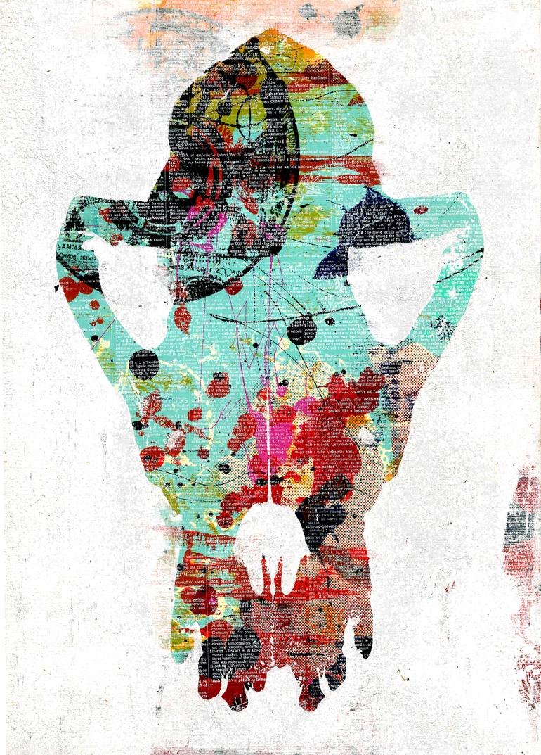 From the "Chaos Prints" series (2017), screenprinting experiment combining multiple designs in one work... Splatters in the background are made by hand, the rest of the layers are handprinted with waterbased colors on 240g paper.