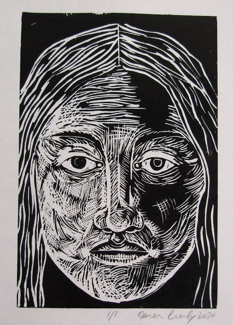 linoprint-head of a girl-printers ink on 25 x 30cm paper....................art by Ronan Crowley, Ireland