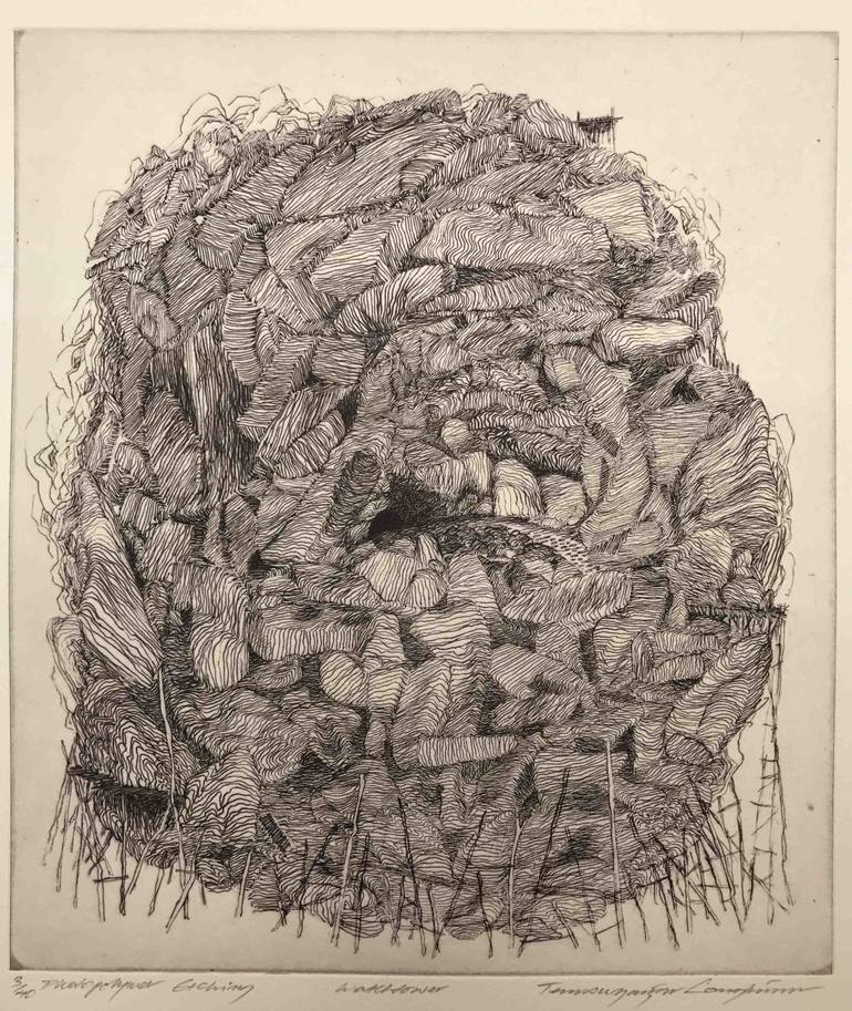 This work is from a series involving over arching ideas relating to human being as a microcosm of events, both within and outside our body. I am particularly interested in the microbial world and their interactions, including in the flora and fauna around us. Photopolymer etching print on Somerset ...