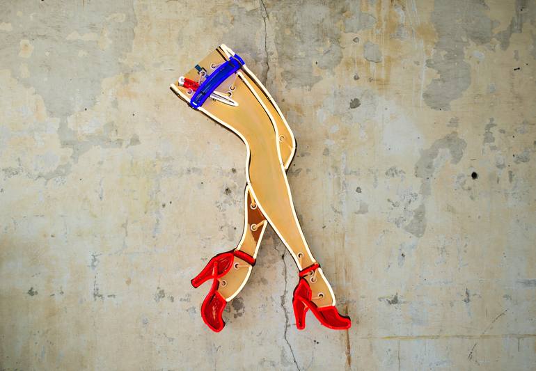 Edition of 10. This piece is called 3 Stilettos because she has a pair of stiletto high heels on her feet, and a stiletto in her garter. This is a style I call a 'partial', meaning that it looks like a portion of a neon sign that was more complete, but this section is removed.