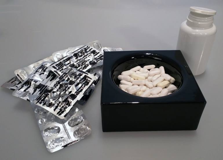 96 Pillole La ceramica accoglie tutte le pillole... Blister vuoti e Portapillole fanno da cornice allo stato di fatto delle persone [ Le pillole, i blister e il portapillole non sono incollati ] -- 96 Pills The Ceramic receives all the pills ... Empty Blisters and the Pillbox are the frame of the s...