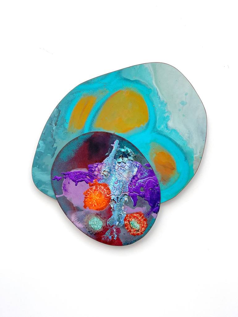 My work is often scientific by nature. I create in a series of experiments as I work with foils and paints at different temperatures to discover the ideal combination for color applications. This piece reminds me of something I might see under a microscope.