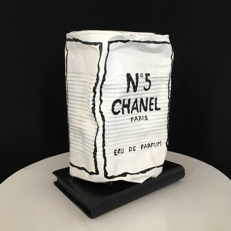 Beautiful sculpture by artist Norman Gekko that displays a Chanel N.5 perfume box made out of a tin can all smashed up.