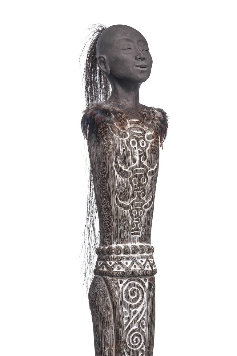 This is a sculpture in my seriers of Messengers. They are travellers through time. Connecting the modern with the ancient well of visdom. The wood base is made in collaboration with a woodworker from Indonesia. I model I clay, hand paint the eyes, and the add materials like horsehair, feathers etc t...