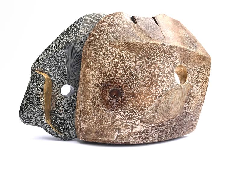 Walking the 'Edgelands' where I live I'm inspired to collect objects, photos and memories of the steps taken, observing the conflict between human needs and the beauty of landscape. Alpha Omega has been cast from two objects found and finished with walnut crystal dye which Henry Moore used for his '...