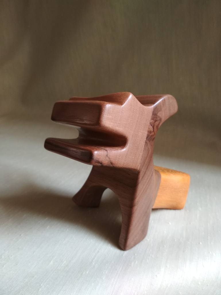 Made out of different wood pieces, carefully chosen for the perfection of form. Gently touch of bright orange mahogany and brightly walnut. This sculpture is made for enjoying the touch of the smoothness of the form. The shape of the art piece is precisely found throughout the contemplation and wood...