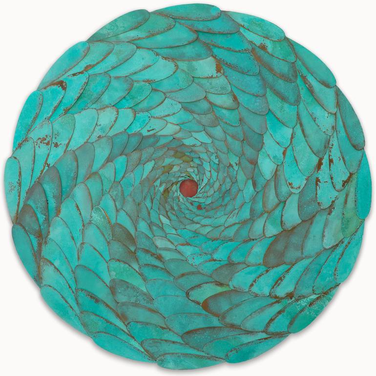 This striking geometric wall mosaic features copper pieces with a rich turquoise patina, each one uniquely textured to create a sense of depth and movement. Arranged in a mesmerizing spiral pattern, the viewer’s gaze is directed toward the center, evoking a subtle energy. While abstract in form, the...