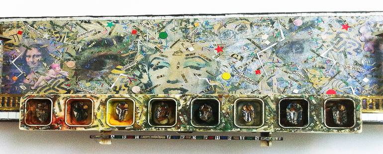 A humorous sculpture with the theme of art criticism, art history, the value of art..materials included, shredded money, preserved peanuts, images of famous art works, names of art critics, and more..a surreal look at the art world. Ready to hang on the wall.