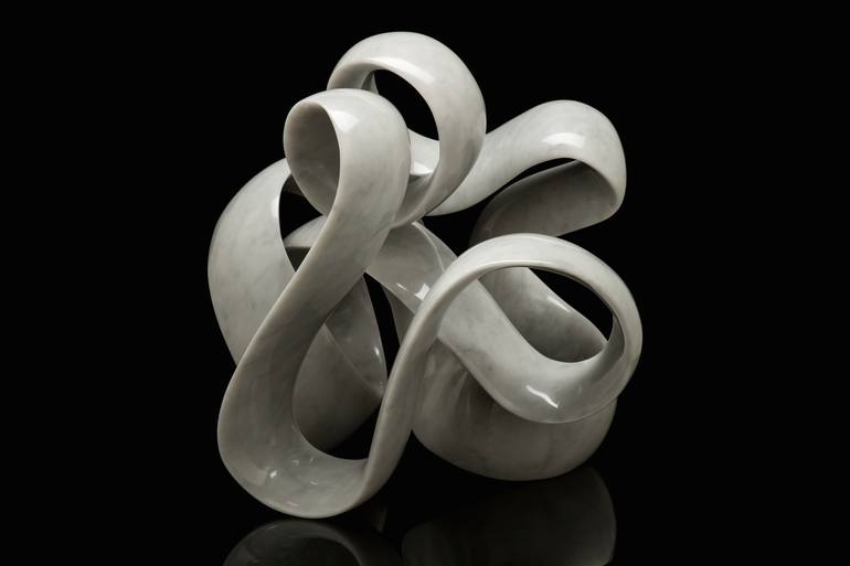 A modern, yet whimsical design in Carrara marble. This piece was carved from a single block weighing over 1200 pounds. The finished sculpture weighs just under 80 pounds, giving the viewer a sense of lightness in an otherwise heavy material. It can be displayed in various positions, although as pic...
