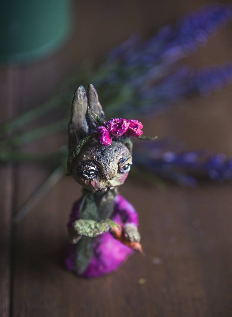 Elevate your space with this one-of-a-kind clay and cotton bunny figurine. Adorned in a charming lilac dress, complemented by a floral headband, this quirky piece showcases a distinctive character with a touch of mystery, portrayed through its enigmatic facial expression. The addition of a carrot en...