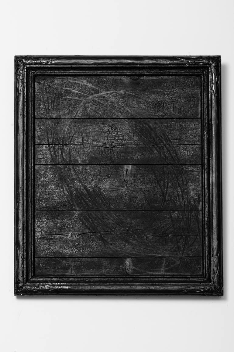 PANELS OF WOOD PAINTED BLACK, SCRATCHED, AND FRAMED.
