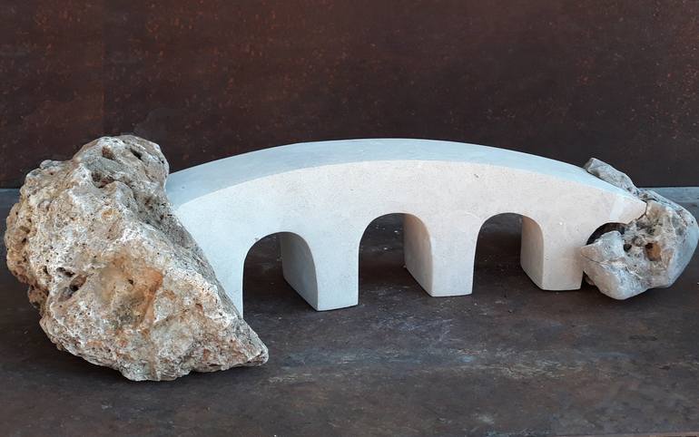 Bridge is a sculpture Ispired by the roman aqueduct. It is a metaphysical sculpture, where the bridge is a metaphor of the passage to another dimension. Bridge is carved in majella stone with smooth surface in contrast to the natural rough texture of the rocks on the sides.
