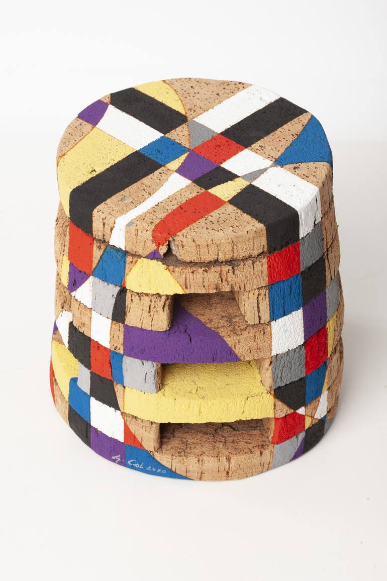 Handmade cork stool. Colored stool designed and built by Graziella and Lorenzo Coi. The “Mesicheddos” series was created by reinterpreting a typical and ancient seat of central Sardinia, called “mesicheddu”, carried out by recovering a habit now almost lost to the slow and painstaking manual proces...