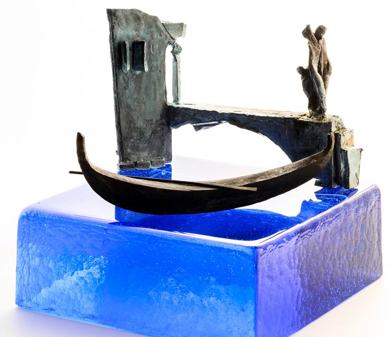 "Be still my heart" Whose heart was not stolen by Venice? One of a kind bronze, on custom cast glass. All parts of the composition are independent and free flowing. Configuration can be changed depending on the mood. The color and the actual size of the glass may vary.
