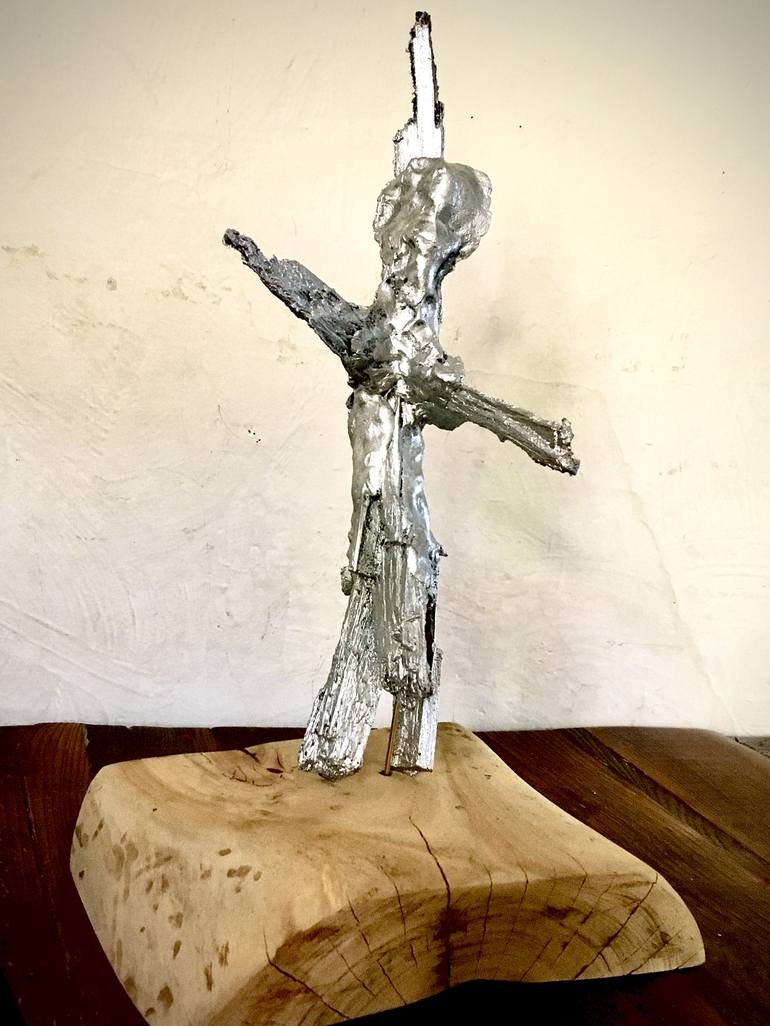 The figure was constructed of sticks, wax, clay and tape before being cast in aluminum. It is made to stand on a natural eucalyptus wood base using a brass rod. The piece can be a companion of “dancers”, which is also made in this basic and direct manner. The sculpture shows a parental figure openin...