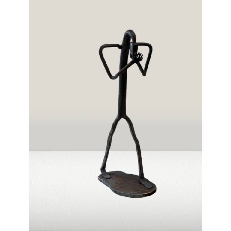 "Chagrin Errant" is an iron sculpture that captures a universal moment of human vulnerability. The man, frozen in a walking posture, head down, face buried in his hands, embodies the weight of emotions that we sometimes carry in silence. The clean lines and robustness of the metal contrast with the...