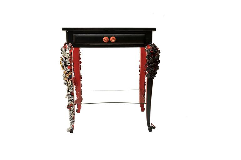 Buttoned and hand painted side table with mirrored shelf. According to psychologists, a need for closure comes from an aversion to ambiguity, in such a light this piece plays on the optical infinity created through the use of mirror, mirrors reflecting the impossibility of such a mindset. A mirror ...
