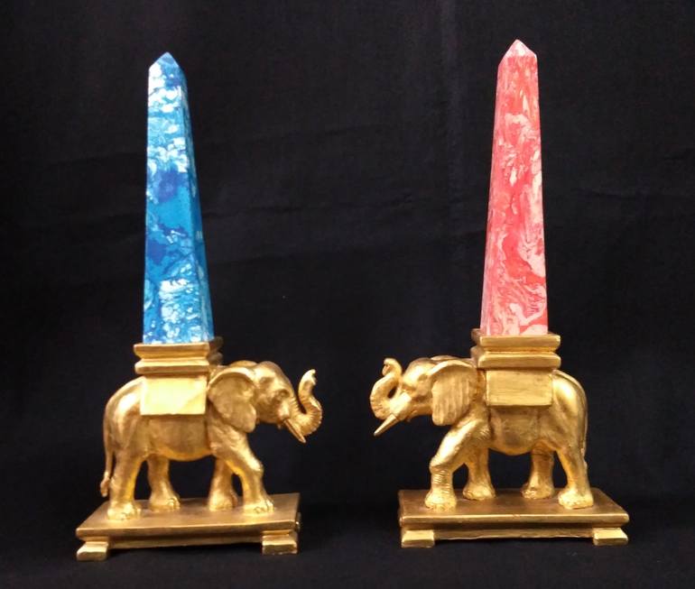 Coppia di elefanti,rivestiti di foglia d'oro zecchino (con l'antica tecnica a guazzo) che portano due obelischi in scagliola policroma.