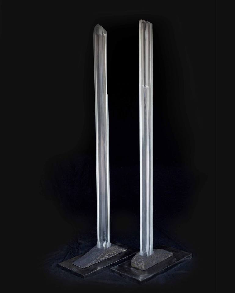Crystal G and Crystal S were part of meteor series. Two lucite beams, each four inches x four inches by 72 inches were carved and polished; bronze feet were molded and cast by artist and placed on stainless steel base. Hole in the bottom for lighting. In natural light they create prismatic effect...