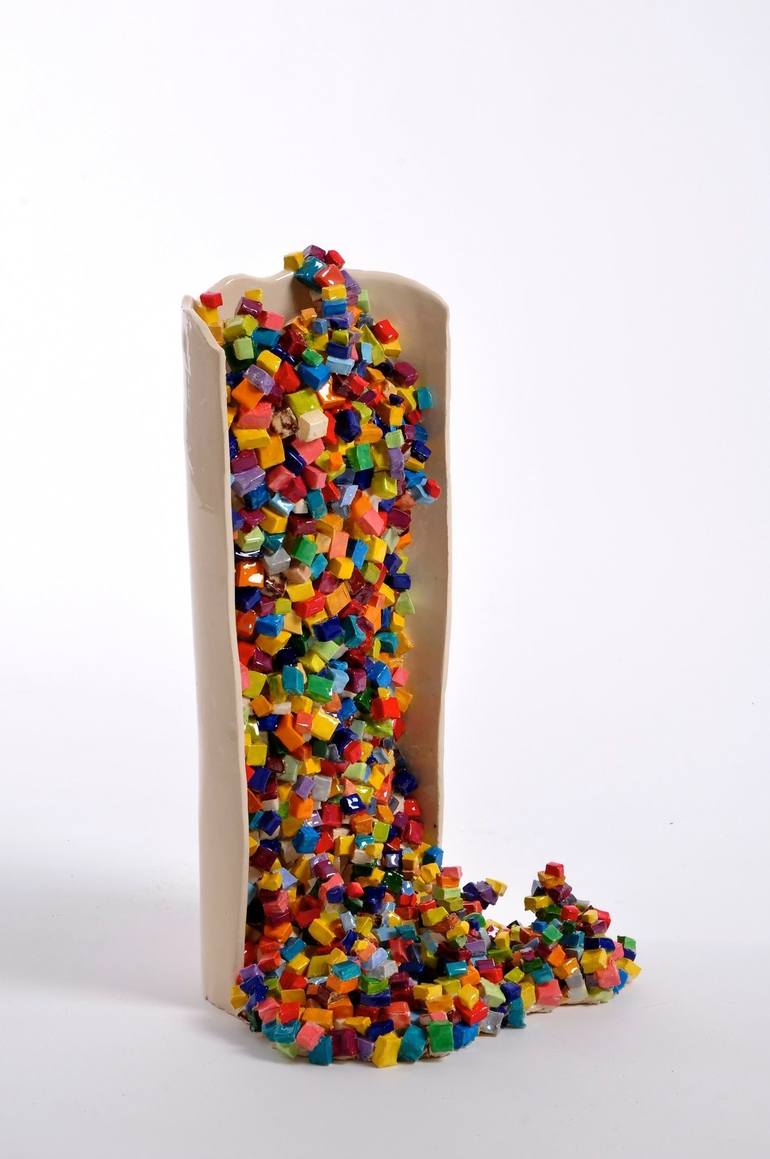 Hundreds of hand glazed ceramic cubes cascade out of the curvaceous form.