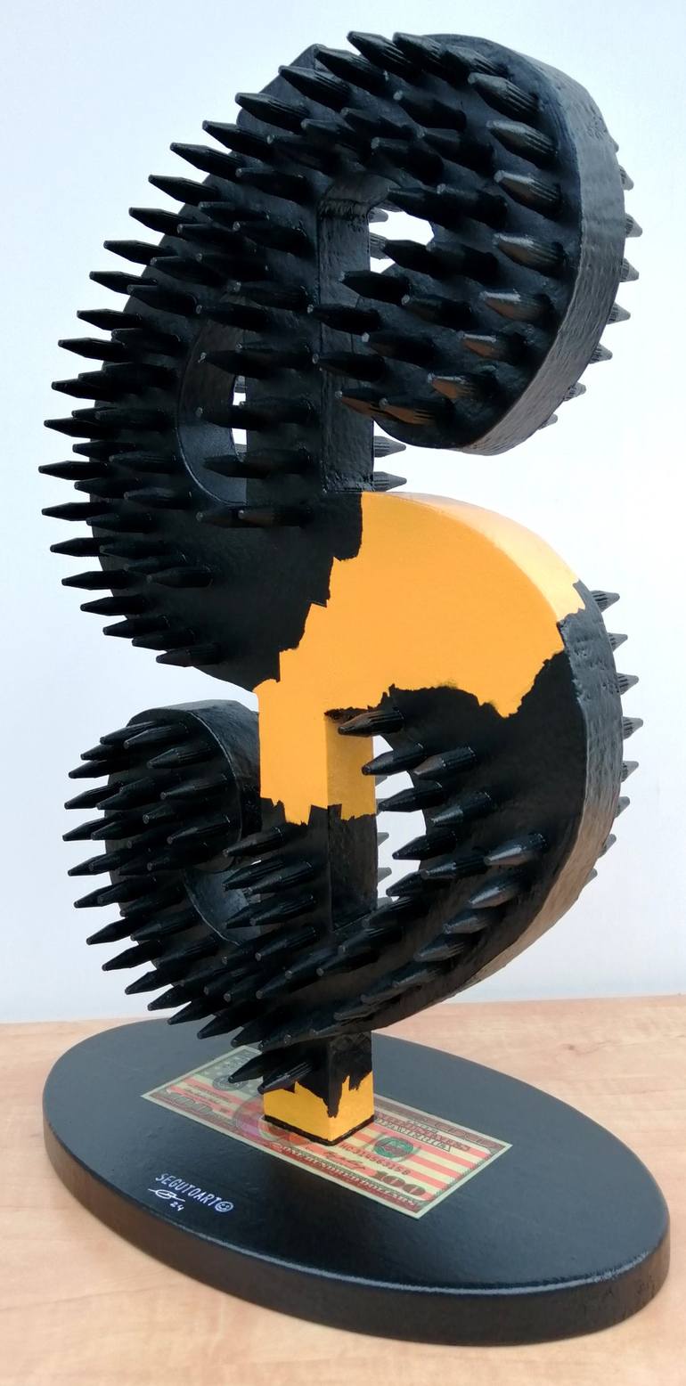 Handmade work in solid wood that ironically represents Andy Warhol's iconic figure of the dollar. Sculpture with sharp wooden tips to create the feeling of untouchability and risk. Warning that there is danger in touching that "dollar"; in any case the temptation to take away the power of money from...