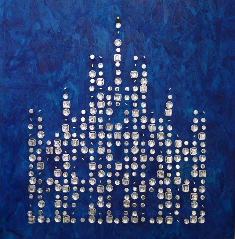 "ma è un Uomo o una Donna? é un Duomo" translation from italian (word pun): is a Man or a Woman? it's a Duomo (Milan cathedral) This wall sculpure raffigure Duomo, the cathedral of Milan Italy One gold cap represents the gold Madonna on top of the real cathedral. This big modern wall sculpture is m...