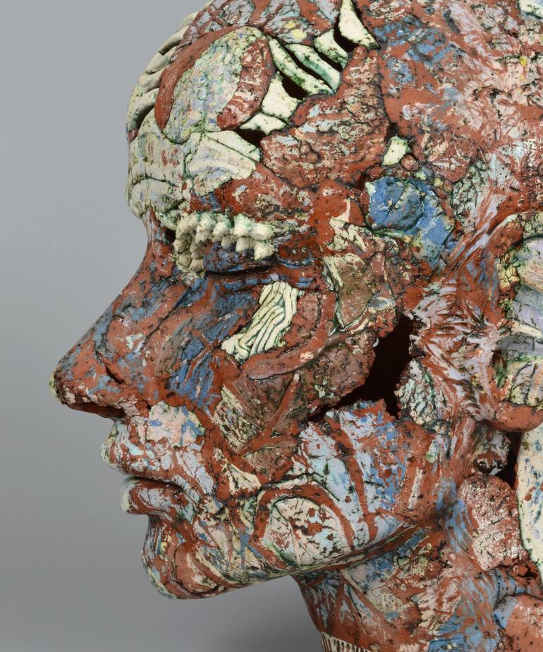 Highly textured ceramic head with fossils and shells incorporated into the surface. This piece is inspired by anatomical art and is intended to be a memento mori.