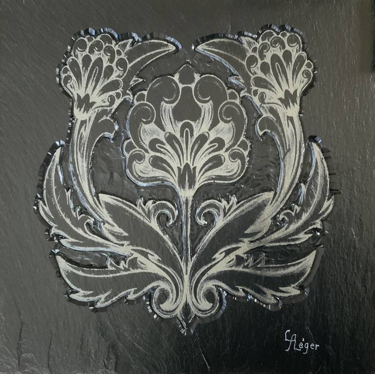 This is a print of a bas-relief carving of a floral design done on black slate quarried in Monson Maine. My father studied architectural design years back and I grew up with his books on the subject and it sparked my interest in ornamental architectural design. Finding slate during my travels in Mai...