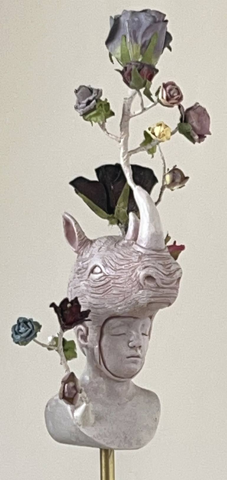 FORZA II is a resin bust of a man with a rhino mask or hat. The piece refers to the metaphorical meanings of the Rhino symbol in ancient cultures: agility, solitary, wisdom, paradox, freedom, stability, gratitude, longevity, judgment, and grounding and peace of mind. For the artist, a Rhino reminds...