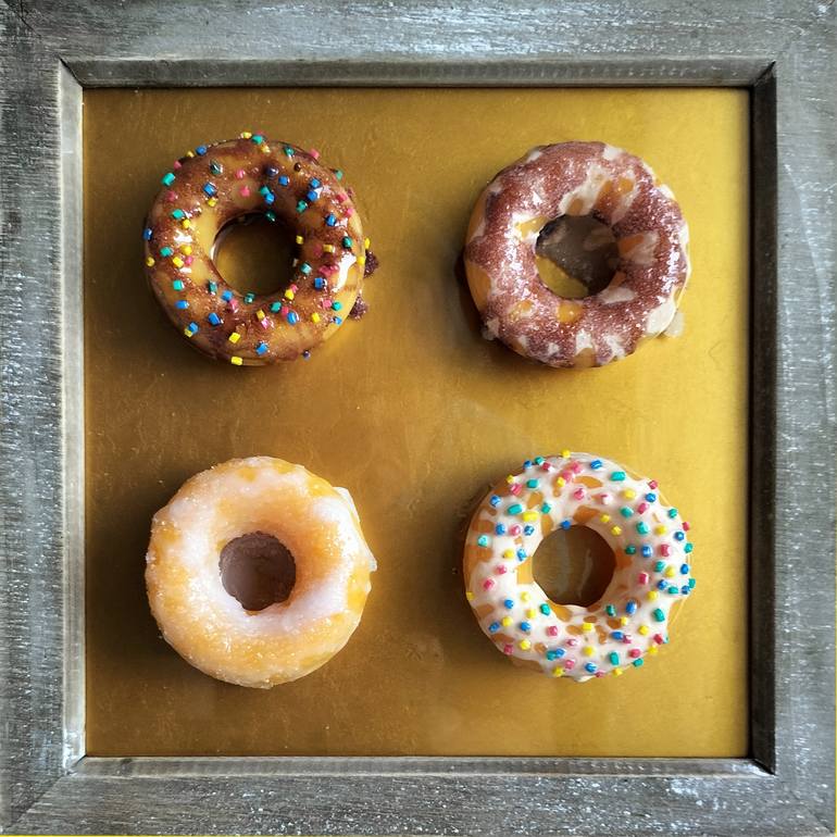 Four resin doughnuts with various toppings made from resin and cut up elestic bands, mounted in a square frame