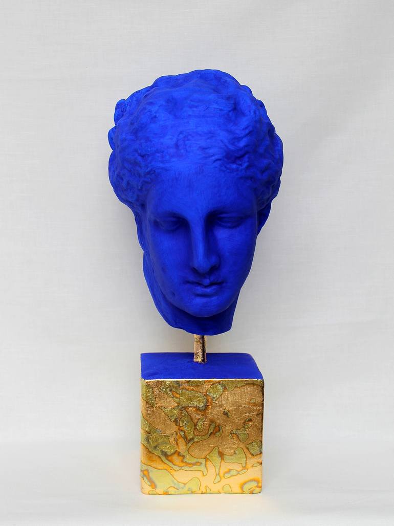 Sculpture representing Hygieia, daughter of Asclepius, god of medicine in Greek mythology. Hygieia is the goddess of health, hygiene and cleanliness. This piece is made of artificial stone,with modern decoration, a vibrant blue color (Granai blue), created by me, and gold leaves. Weight: 2.5 Kg.