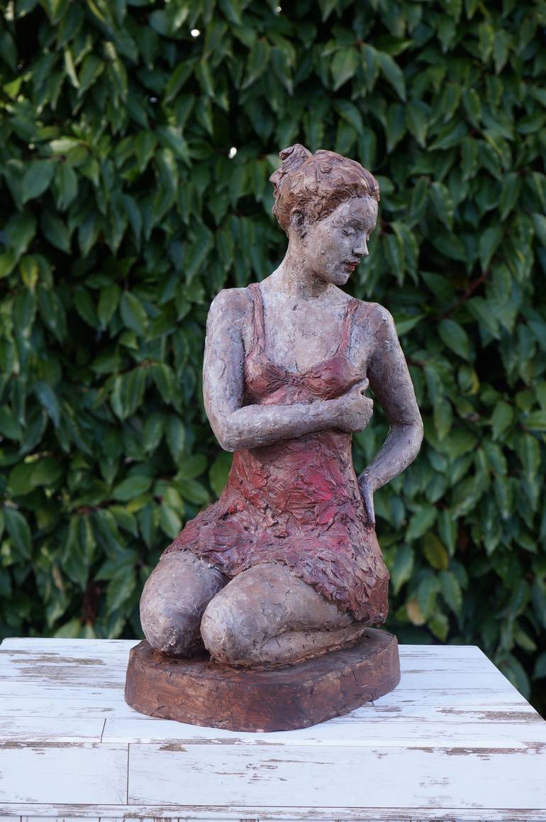 Girl in red dress started as a nude figure but in the process I got inspired to add the dress. Work is done in clay then fired in the kiln and painted.