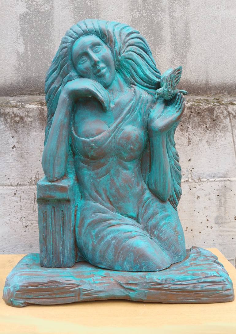 Female image based on ancient times. Beautiful past, a bit of green and a bird. Material wood - alder, tinted with acrylic color, oil, water-based varnish coating.