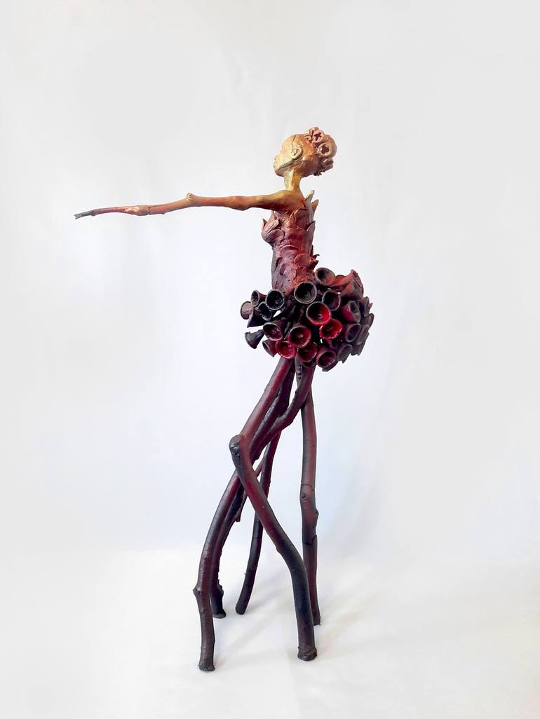 Whispering Roots This sculpture poetically and imaginatively portrays the fusion of humanity and nature. The figure of a woman with a golden body stands gracefully, her arms outstretched. What makes this piece truly unique is her skirt, crafted from eucalyptus seed pods (gum nuts)—natural elements t...