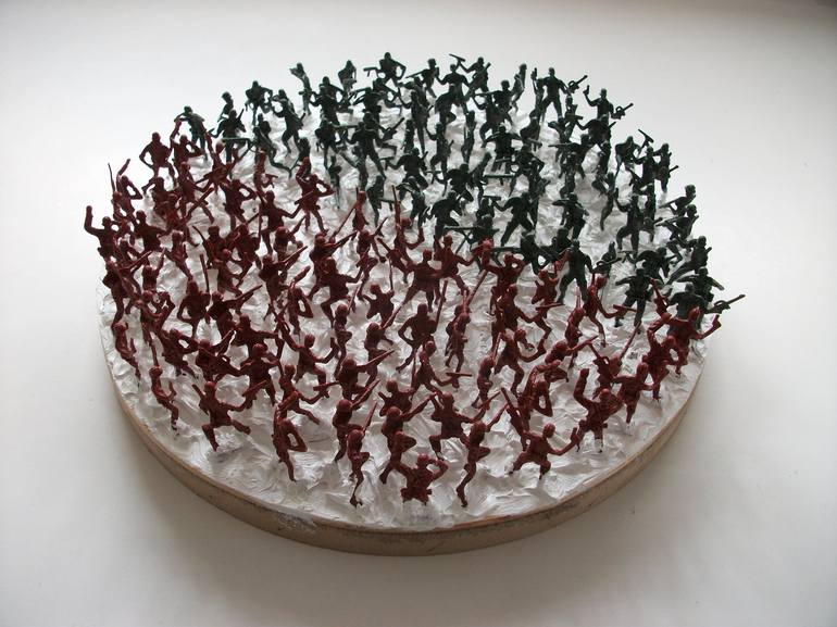 This assembly made in the shape of a birthday cake with war toy dolls in two different colours, which semantically associate ideas related to celebrations, war, childhood and gifts from adults. The toys are adhered to the circular wood with white oil paint that, while separating and isolating them, ...