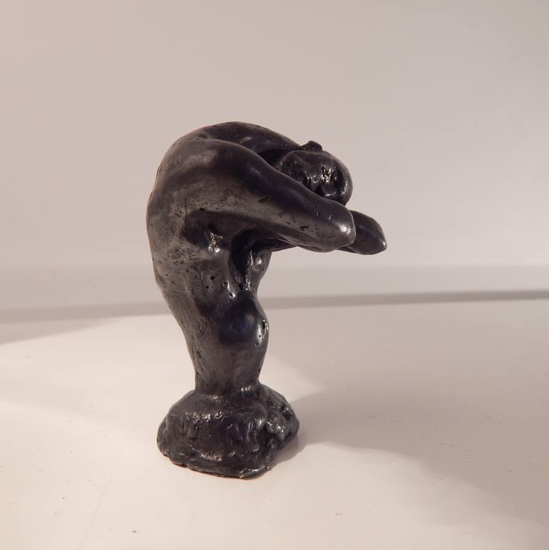 A heart shaped male torso with head and arms touching his heart - a symbol of emotional side of introspection. His head is bent and placed on his shoulder with his eyes closed - he's in a dream like state. He's thinking and feeling at the same time.