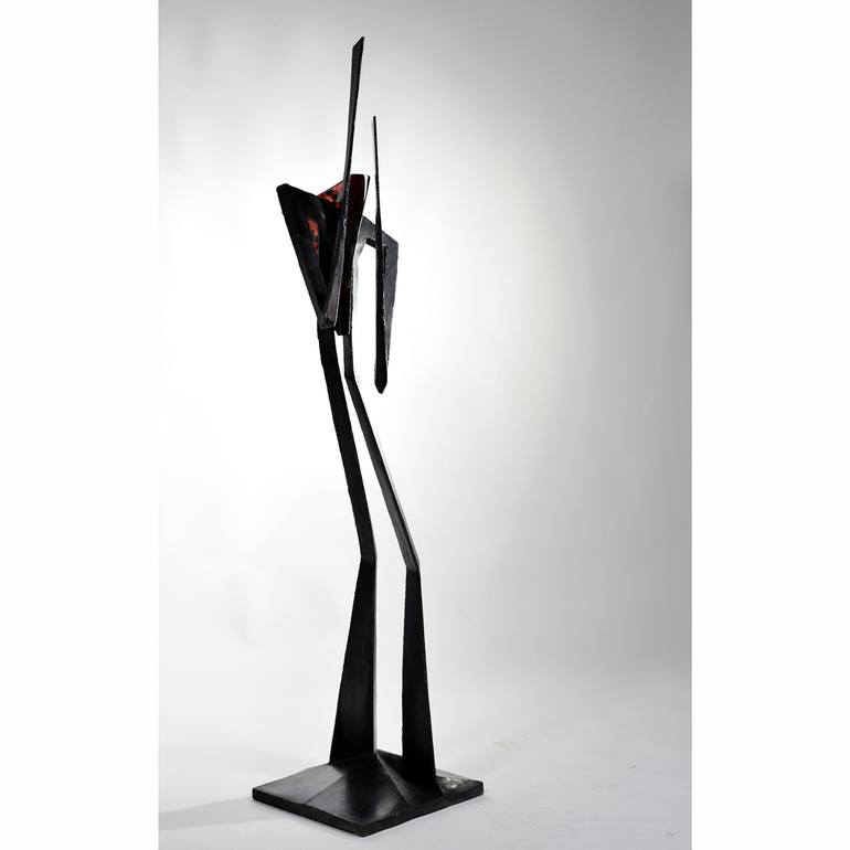 André van der Linden (1945 Amsterdam). André studied for some time at the Rijksacademie in Amsterdam, but is self-taught as a sculptor. He has been working as a sculptor since 1967 and settled as such in Friesland in 1972. Until 1978 André mainly worked in wood, which was sometimes painted in primary colours. Subsequently, a combination of materials was often used. At first wood was combined with stone, until the wood faded into the background and stone sculptures appeared, sometimes in combination with ferrocement. Working with ferrocement, the core of which is an iron construction, eventually led to the fact that the cement was omitted and the stone statue was combined with stainless steel. The white of the steel did not always combine with the idea to be executed, so that the dark bronze was added as a new option. Gradually, the stones disappeared from the statues and there are now combinations of steel and bronze, where glass is often a colorful addition. Over the course of 55 years, there has also been a change in starting points. Initially, images appeared with a mainly inner strength, later a transition was made to a much more sober visual language and in the following period we now see greater expressiveness again, in which what moves and sets the individual in motion is a recurring starting point. . A further abstraction of these moving figures offers the viewer freedom of interpretation. In the words of Huub Mous: Nothing is as obvious on closer inspection as it seems at first. This certainly also applies to the images of André van der Linden. The artist who lives and works in Friesland has built up an impressive track record. Many of his sculptures have been given a permanent place in public space. André van der Linden's work invites reflection. Although the artist derives formal starting points from geometry and stereometry, his images escape cool calculation and law. Additions that seem incongruous at first glance act as counterpoints to constructivist elements. The images derive their visual tension from this duality. During the process of combining and assembling, shaping and deforming, the artist works with contrasts. He gives shape to processes of change, to cycles that determine the natural course of events and to human power and inability to influence them.