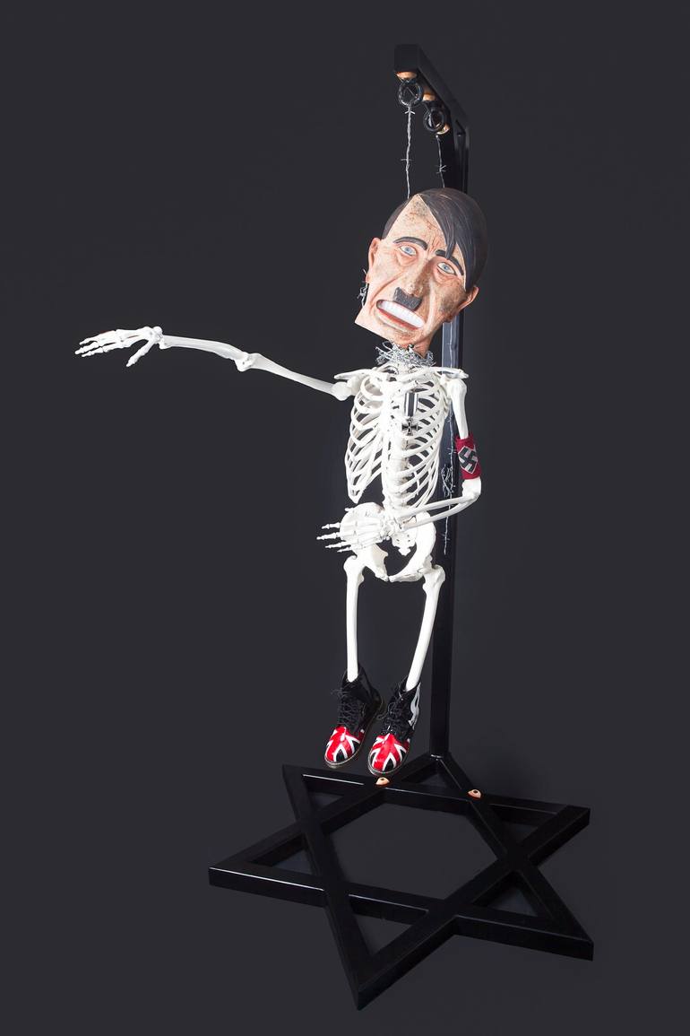 The piece shows Hitler, consisting of a 1942 funfair Hitler face made for the public to shoot at with an air rifle, a human skeleton body and wearing ‘Bovver’ boots which depict the opening credits from the TV series, Dad’s Army. Hitler has been hung by wire from a gallows, the base of which represe...