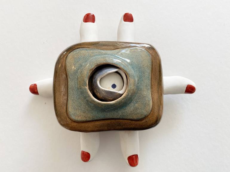 This is part of a series of sculptures based on idiomatic expressions.. this is my way to represend someone who is all thumbs. The central big eye is movable, as well as all the fingers, thus creating sound when the sculpture is picked up