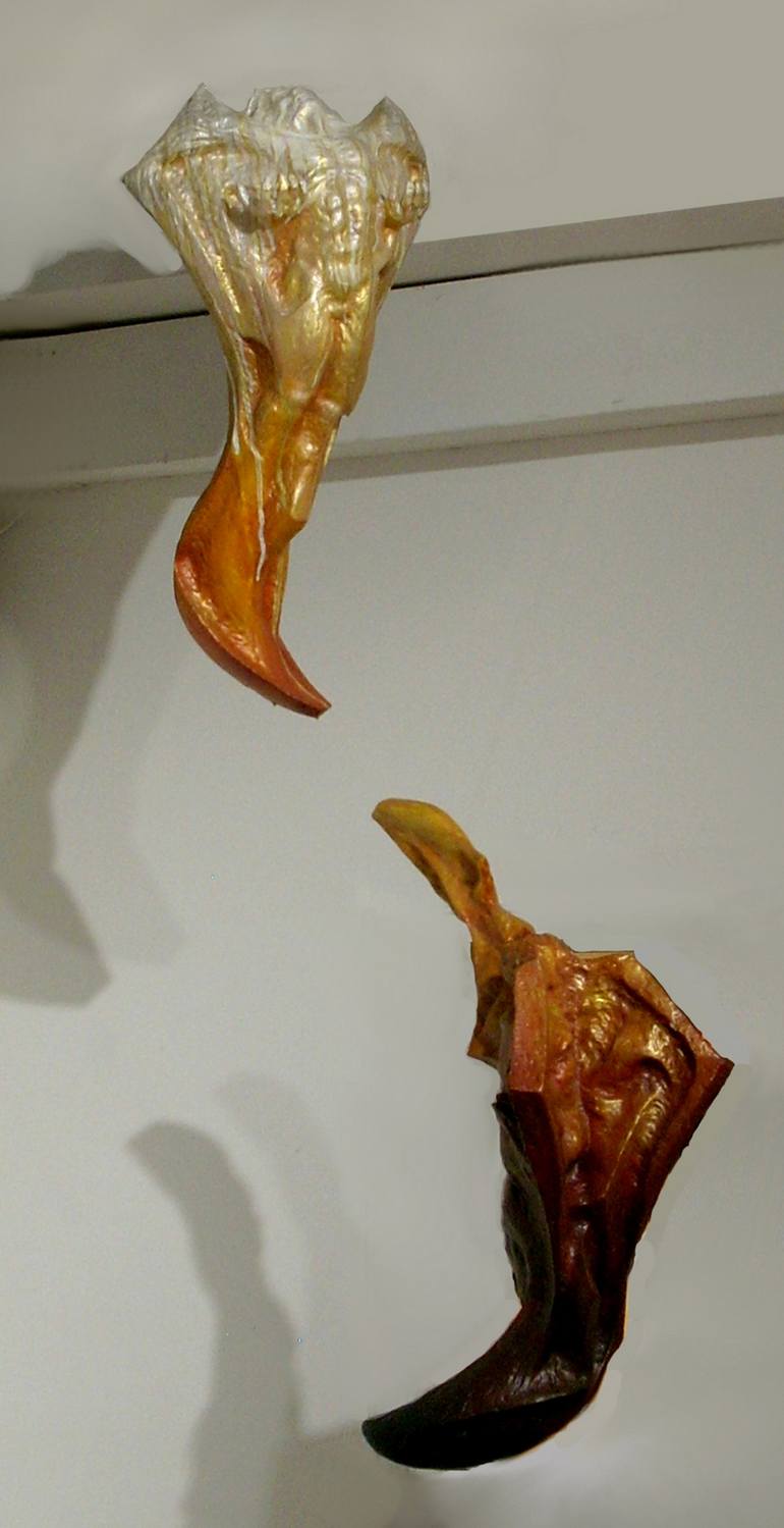 Made of very light polystyrene (Styrofoam), this piece hangs on extremely thin, almost invisible nylon line. I have loved Greek Mythology since college and feel this piece tells the myth well. The composition of the two figures is a spiral and captures the sense of heat from the sun in the way it is...
